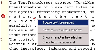 First you have to put the mouse cursor on the desired position in the input text. Now you can set the break point with the pop up menu, which appears, if you click the right mouse button. You also can use the menu: Start->Toggle breakpoint